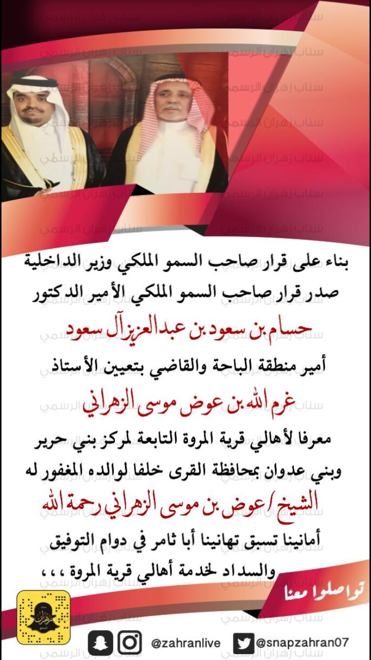 سناب زهران الرسمي A Twitter بناءا على قرار صاحب السمو الملكي وزير الداخلية صدر قرار صاحب السمو الملكي الأمير حسام بن سعود أمير منطقة الباحة بتعيين أ غرم الله عوض بن موسى معرفا